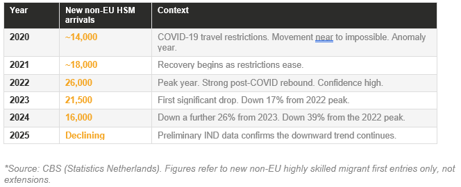 That is what makes the current trend so striking. For most of the past two decades, the number of non-EU highly skilled migrants choosing the Netherlands grew consistently. The only exception was 2020, when COVID-19 made movement impossible. What followed in 2021 and 2022 was a strong recovery. But since the 2022 peak, the direction has reversed ,and the decline is accelerating.